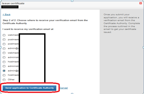 - Klik “Send Application to Certificate Authority”. Kemudian email approval akan terkirim ke email admin@namadomain