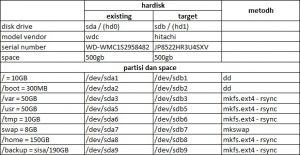 Untuk hardisk existing atau hardisk lama (sda) atau hardisk yang hendak diganti dengan melakukan cloning datanya terhadap hardisk target atau hardisk baru (sdb). Pada dokumentasi ini menggunakan hardisk yang memiliki space sama besar dengan kondisi partisinya seperti tabel tersebut diatas. Karena pada dokumentasi artikel ini menggunakan space yang sama besar, maka hardisk target akan memiliki partisi dan space yang sama. Khusus untuk partisi “/boot” dan “/” karena merupakan partisi dengan disk usage paling sedikit diantara partisi lain maka akan diproses menggunakan perintah dd clone.